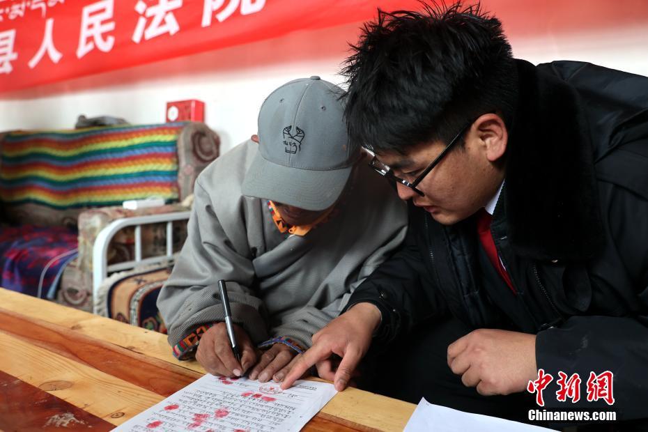 6月3日,在青海省果洛藏族自治州瑪多縣花石峽鎮,瑪多縣人民法院“馬背法庭”的法官在牧民家中完成調解并簽字確認。薛蒂 攝