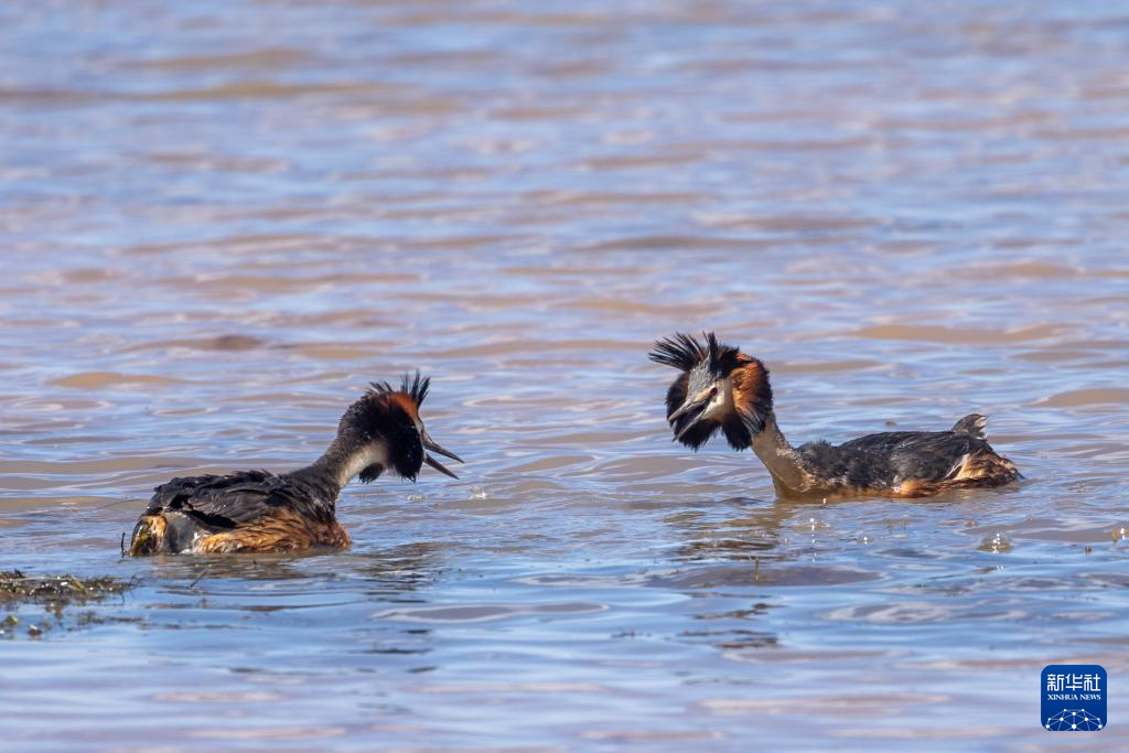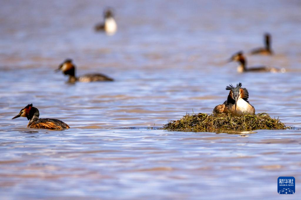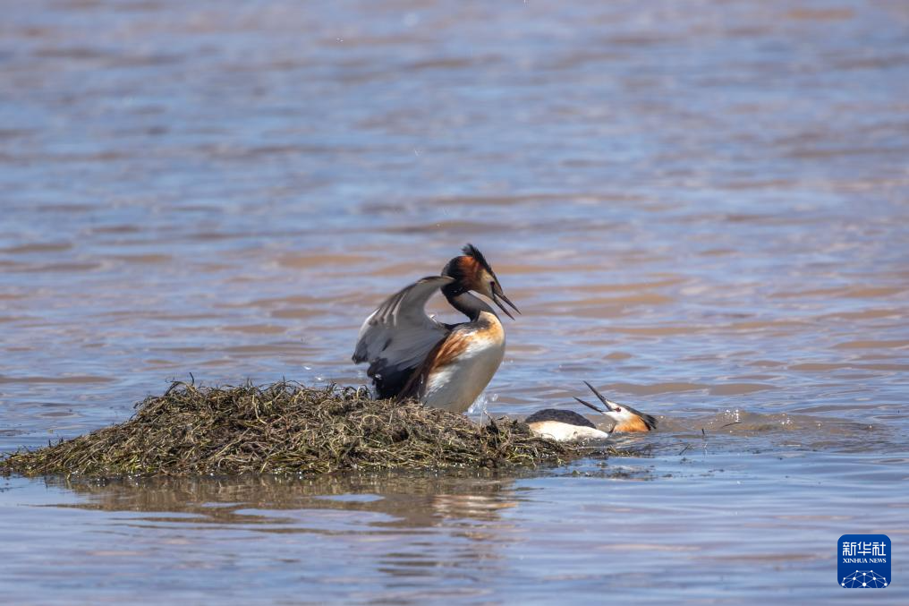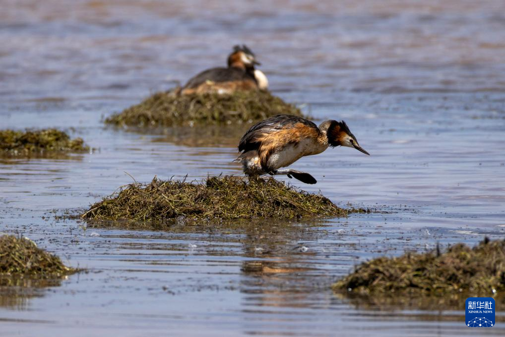 時值初夏,一群鳳頭鸊鷉在西藏自治區那曲市申扎縣下過鄉格仁錯旁邊的濕地營巢孵卵,準備迎接新生命的誕生。