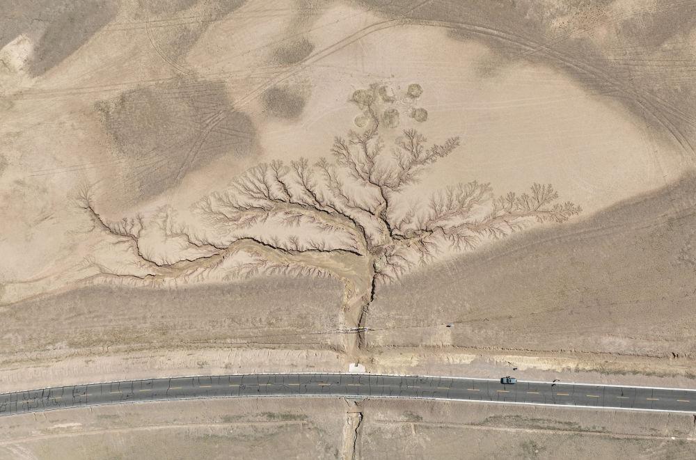 在西藏那曲市,317國道的2442里程碑附近有一處被稱作“天空之樹”的神奇景觀。由于此處地勢條件特殊,流水沖刷大地,進而形成從空中俯瞰如大樹一般的痕跡。