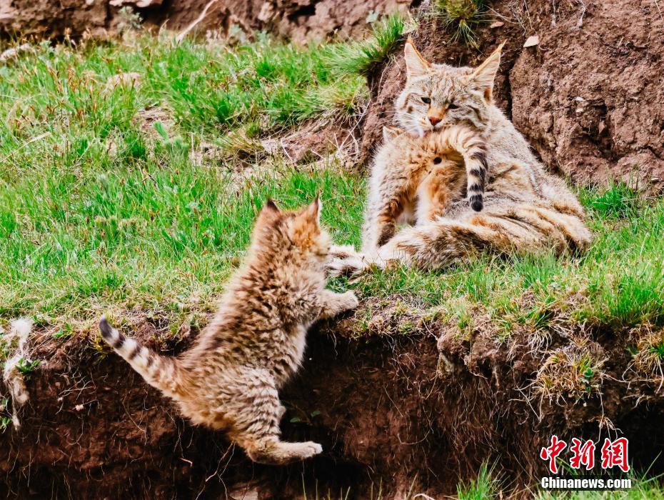 6月15日,盛夏時節,在青海省海北藏族自治州海晏縣哈勒景蒙古族鄉查庫太草原上,攝影愛好者拍攝到荒漠貓幼崽出窩“踏青”的畫面。畫面中,荒漠貓幼崽或是與媽媽嬉戲玩耍,或是“哥仨”追逐打鬧,或是練習捕獵技巧,甚是呆萌可愛。荒漠貓分布于青藏高原東部,是中國特有的貓科動物,國家一級重點保護野生動物。