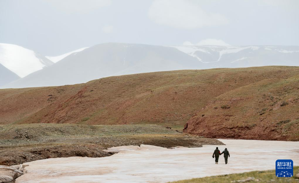 6月15日,羌塘國家級自然保護區野生動物專業管護隊員索朗(右)和羅布檢查河面冰凍情況。新華社記者 費茂華 攝