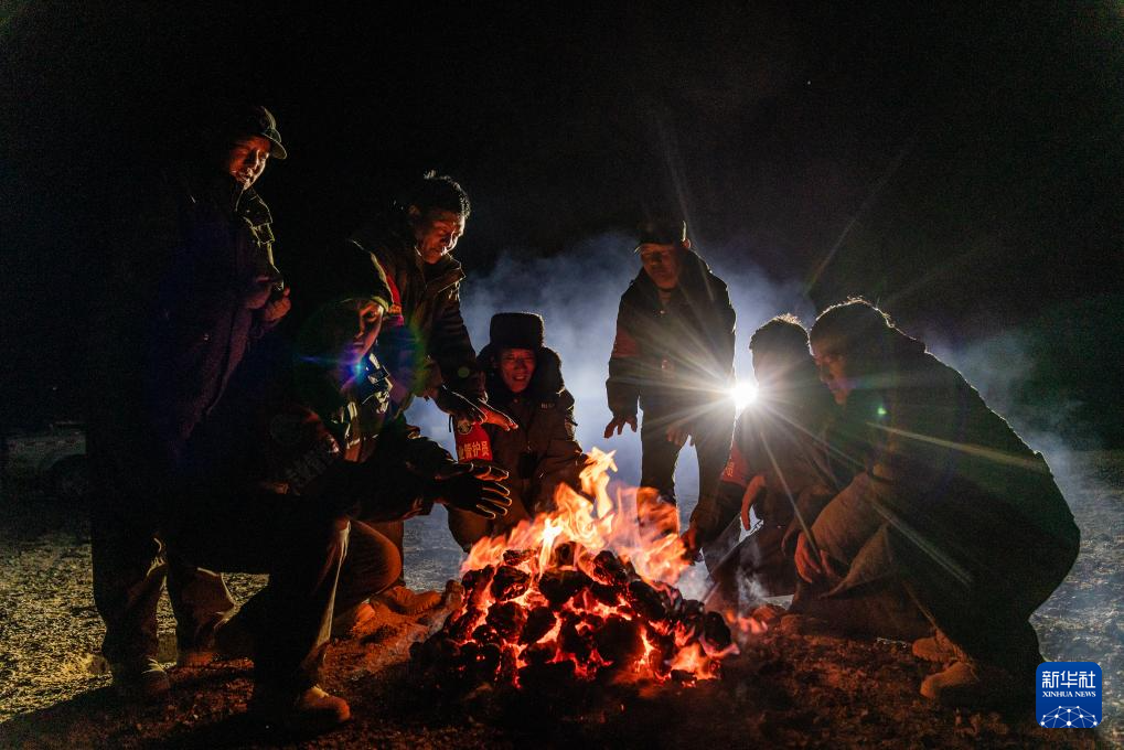 5月10日,野生動物專業管護隊員在宿營地用野牦牛糞烤火取暖。新華社記者 丁增尼達 攝
