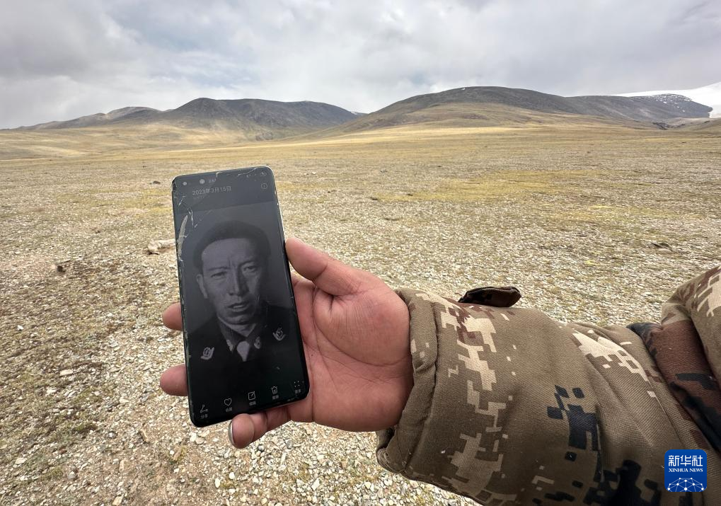 6月15日,格桑倫珠向記者展示他手機中珍藏的羅布玉杰的照片。新華社記者 費茂華 攝