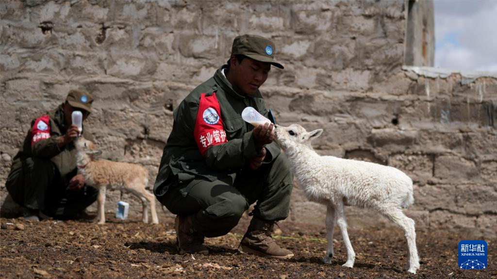尼瑪縣措羅木管護站野保員在給藏羚羊幼崽喂奶(7月13日攝)。新華社發(旦增攝)