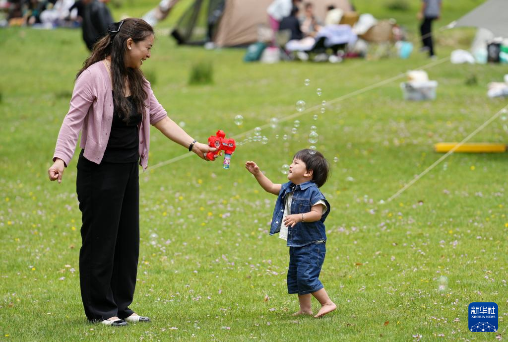 7月14日,家長(zhǎng)和孩子在“神秘樹(shù)林”的草地上玩泡泡機(jī)。新華社記者 張汝鋒 攝