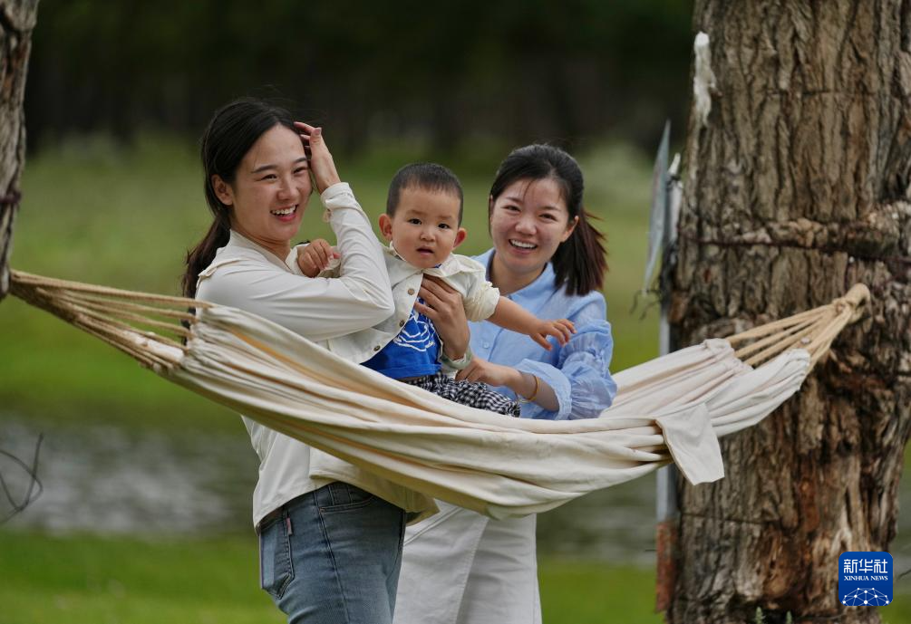 7月14日,游客帶孩子在“神秘樹(shù)林”里的吊床上玩耍。新華社記者 張汝鋒 攝