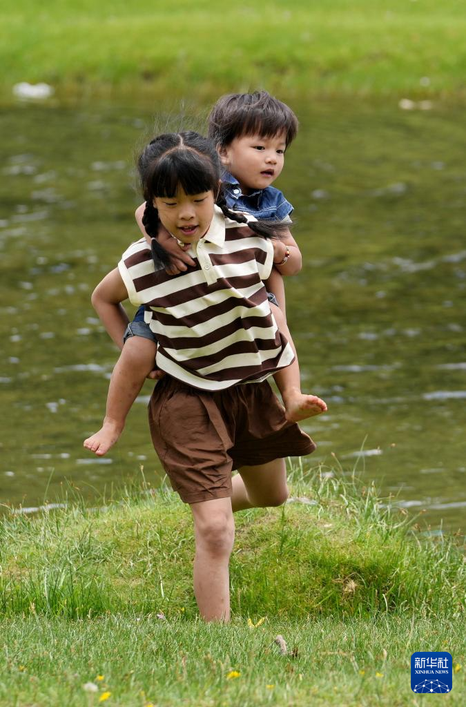 7月14日,孩子在“神秘樹(shù)林”水邊玩耍。新華社記者 張汝鋒 攝
