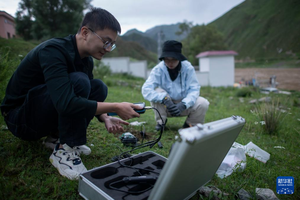 7月20日,在直門達水文站,長江科學院空間信息技術應用研究所廖茂昕(左)和付珺琳進行土壤多參數檢測。新華社記者 伍志尊 攝