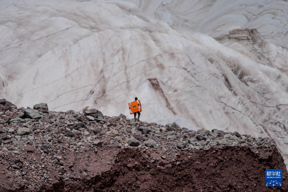 7月25日,在冬克瑪底冰川,科考隊員背負設備攀爬冰川。新華社發(杜笑微 攝)
