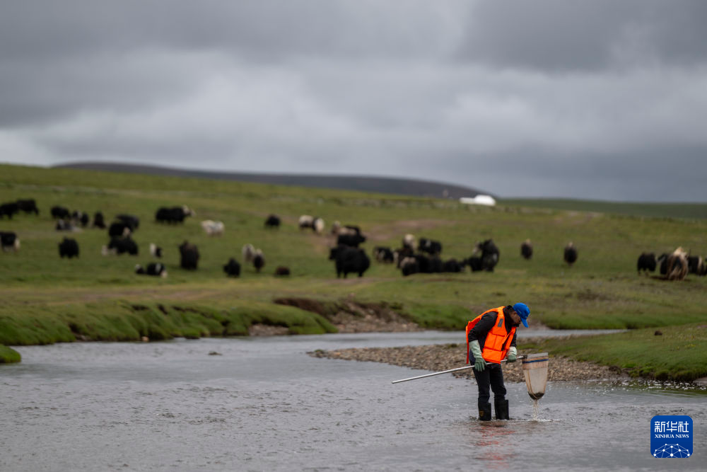7月22日,在當曲源,科考隊員進行底棲生物監測采樣。新華社記者 伍志尊 攝