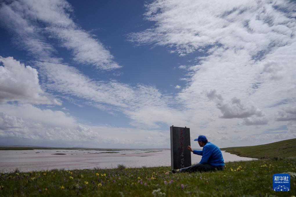 7月24日,在囊極巴隴,科考隊員在為紀念碑上的字體描紅。新華社發(fā) 杜笑微 攝