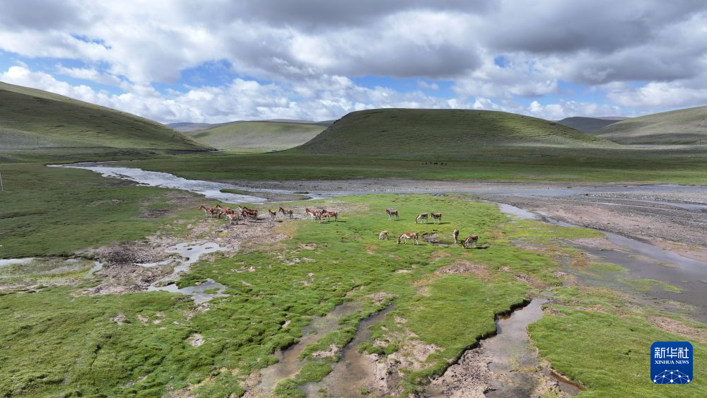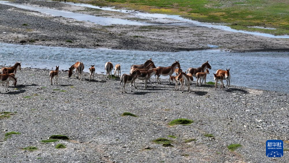 8月9日在青海省玉樹藏族自治州曲麻萊縣境內拍攝的藏野驢(無人機照片)。新華社 昂江 攝