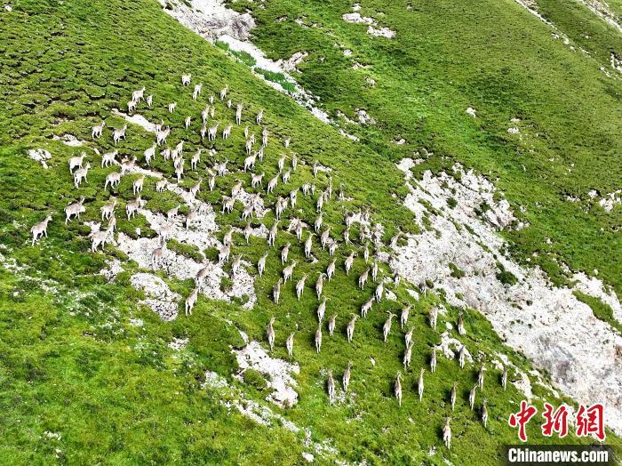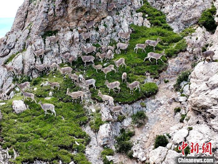 圖為成群巖羊在山坡上結(jié)伴而行。才新木加 攝