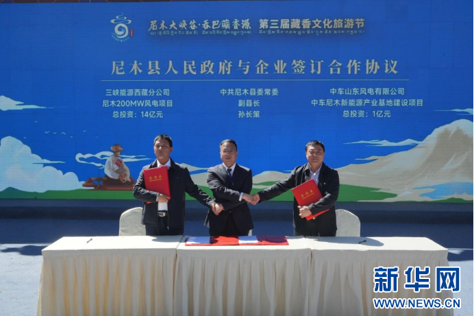 開幕式上,尼木縣委常委、副縣長孫長策與中國三峽新能源集團(tuán)股份有限公司西藏分公司、中車山東風(fēng)電有限公司、拉薩明陽新能源有限公司和華電新能源有限公司的代表完成簽約儀式,達(dá)成互利共贏的合作關(guān)系?! ??