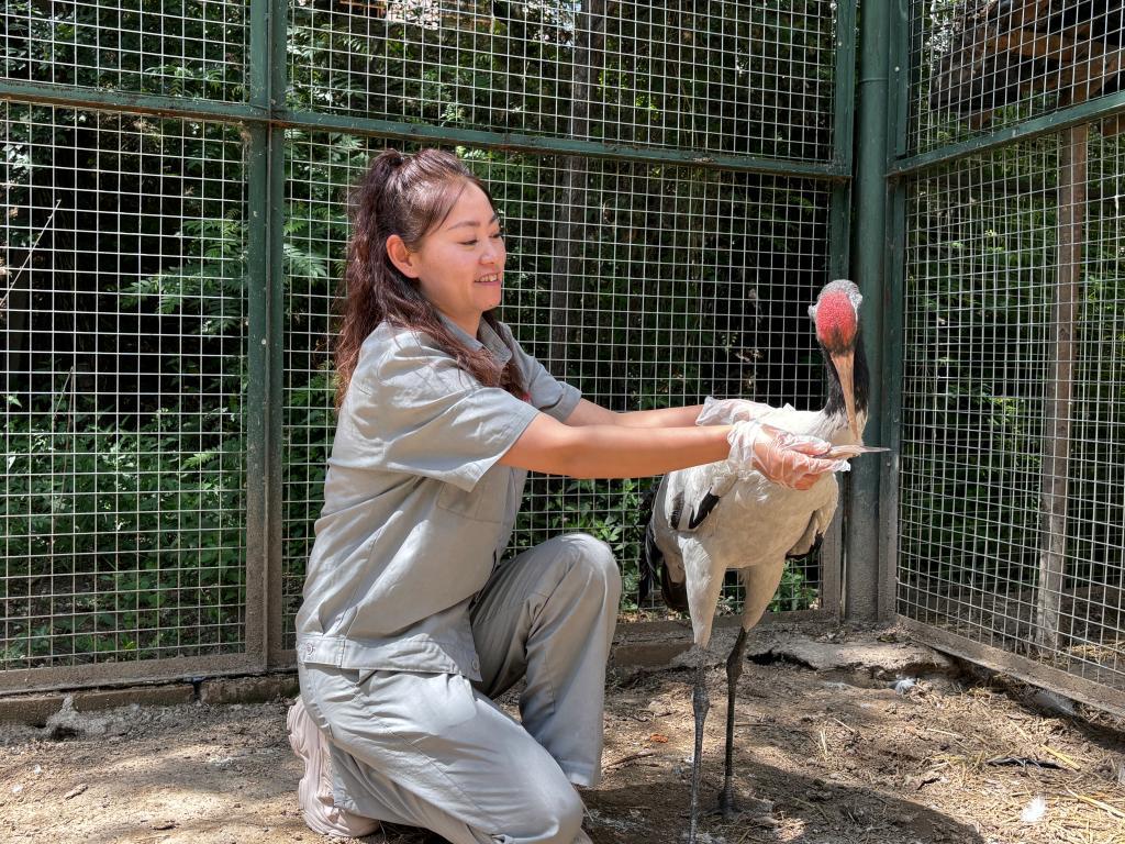 7月3日,西寧野生動物園飼養員李曉清在給黑頸鶴喂食。新華社記者 周盛盛 攝