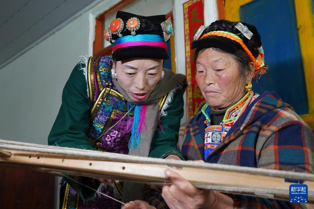 10月7日,能卡曼(左)在工作室帶領游客體驗牦牛毛紡織技藝流程中的捻線。新華社記者 胥冰潔 攝