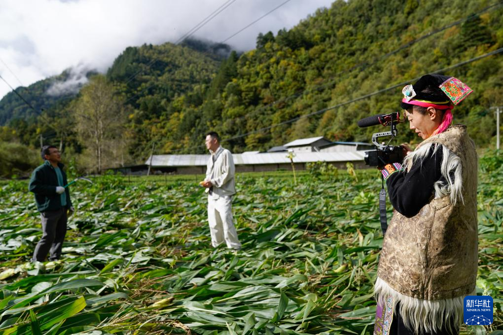 10月8日,能卡曼(右)在四川雅安寶興縣磽磧藏族鄉夾金山村的田地里拍攝視頻素材。新華社記者 胥冰潔 攝