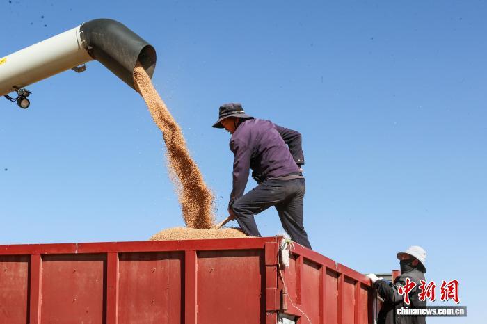 圖為農民將分離好的麥子裝車。中新社記者 薛蒂 攝