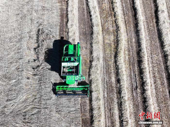 圖為小麥收割現場。(無人機照片)中新社記者 薛蒂 攝