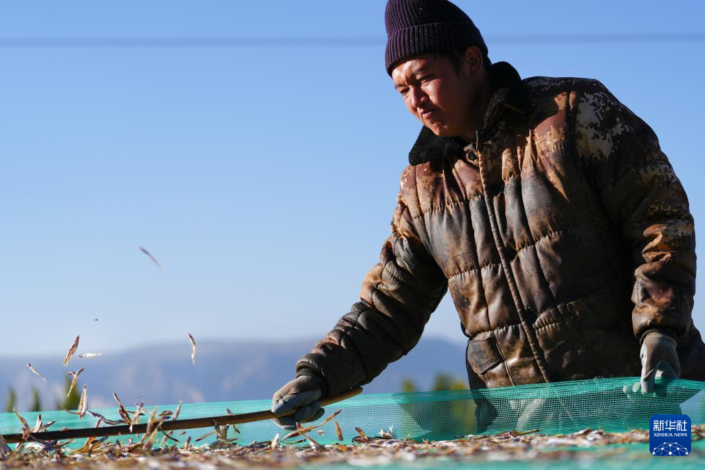 10月18日,在青海省海南藏族自治州共和縣龍羊新村龍羊峽海湖漁業捕撈合作社,一名工人將曬好的小銀魚抖散,以防在后續加工中出現粘連。新華社記者 齊芷玥 攝