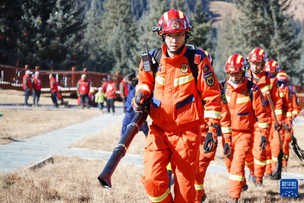 11月8日,在青海省海北藏族自治州祁連縣阿咪東索林區,祁連縣消防救援大隊消防員準備向護林員演示森林草原滅火裝備的操作方法。新華社記者 齊芷玥 攝
