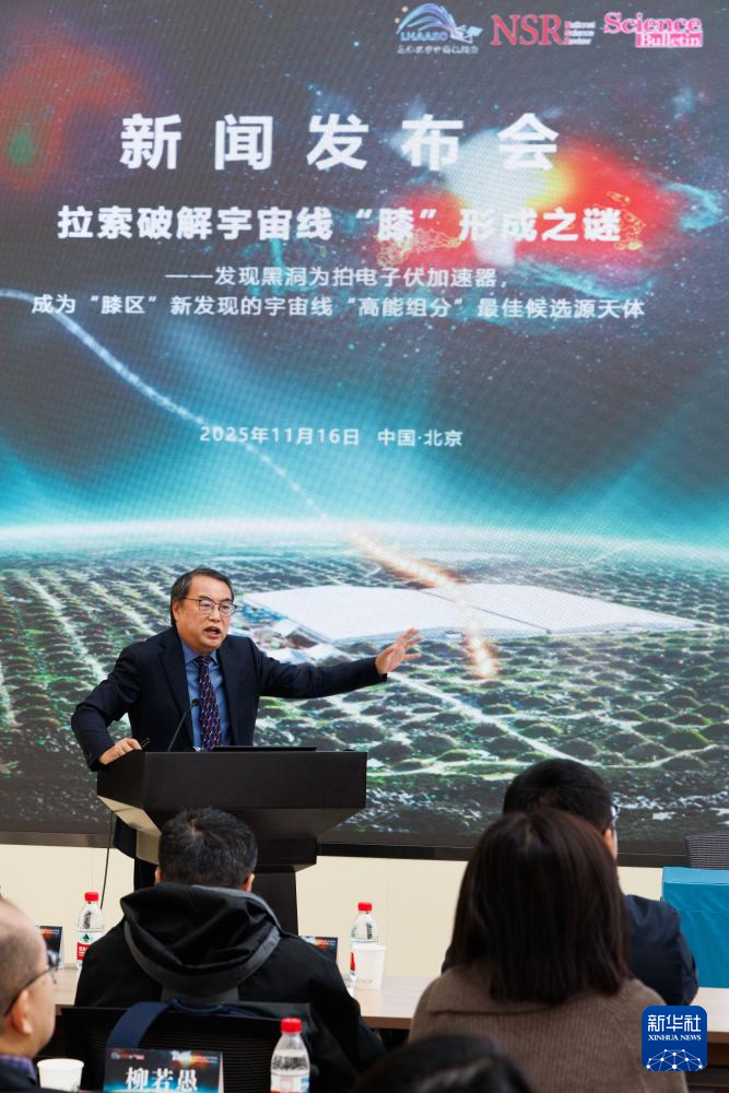 11月16日,在中國科學院高能物理研究所舉行的發布會上,“拉索”首席科學家、中國科學院高能物理研究所曹臻院士在介紹科學成果。新華社記者 金立旺 攝