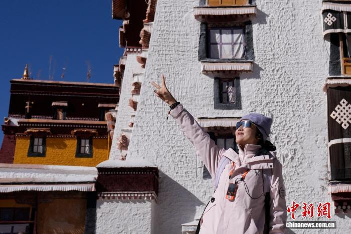 1月7日,游客在布達拉宮內拍照留念。當前正值第八輪“冬游西藏”市場促進活動開展期間,西藏推出包括布達拉宮在內的多家景區免門票優惠,吸引游客前來參觀。中新社記者 李林 攝