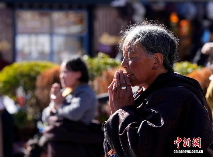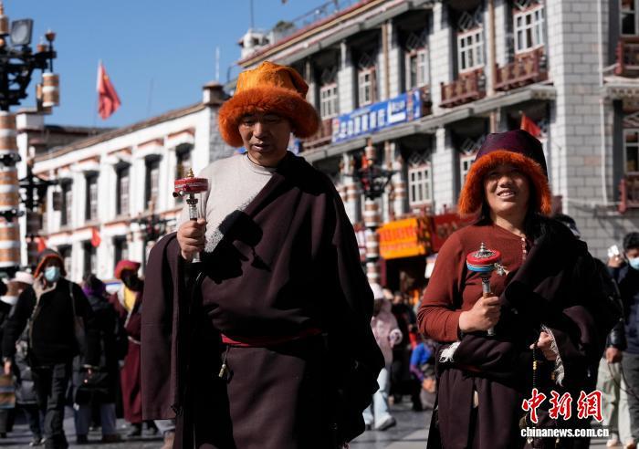 1月23日,西藏拉薩八廓街,信眾手持轉經筒轉經。冬季高原進入農閑期,眾多藏傳佛教信眾從各地來到拉薩,沿布達拉宮、大昭寺等地轉經、朝拜、祈福。中新社記者 李林 攝