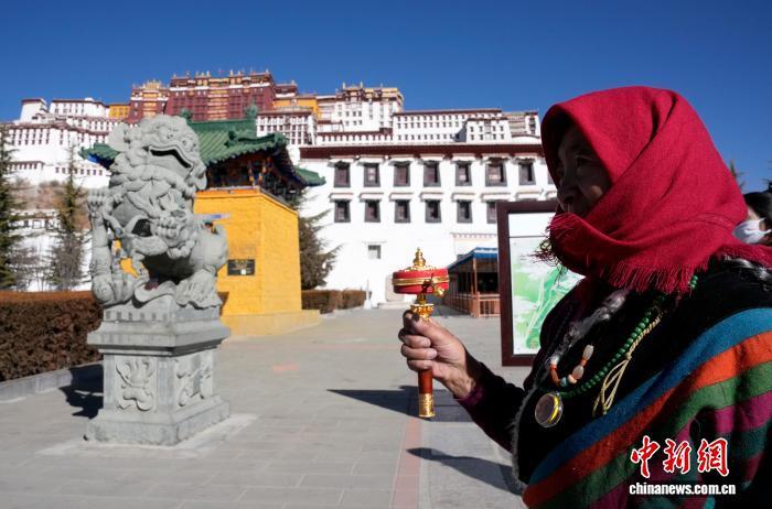 1月23日,西藏拉薩布達拉宮腳下,信眾手持轉經筒轉經。冬季高原進入農閑期,眾多藏傳佛教信眾從各地來到拉薩,沿布達拉宮、大昭寺等地轉經、朝拜、祈福。中新社記者 李林 攝