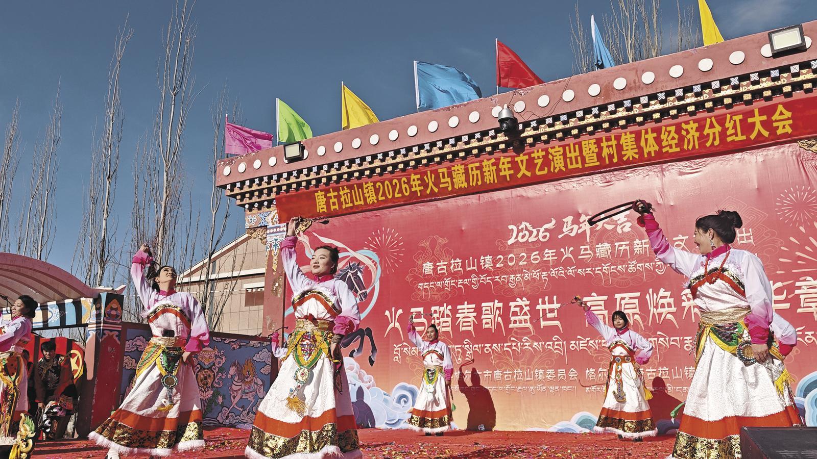 中國藏族網(wǎng)通訊   2月5日,海西蒙古族藏族自治州格爾木市唐古拉鎮(zhèn)洋溢著濃厚的節(jié)日氛圍,2026年火馬藏歷新年文藝演出暨村集體經(jīng)濟分紅大會在這里舉行。村民身著絢麗民族服飾,以一場精彩紛呈的文藝盛宴共迎佳節(jié)。隨后舉行的村集體經(jīng)濟分紅大會,將活動推向高潮。2025年,唐古拉鎮(zhèn)全鎮(zhèn)7個行政村集體經(jīng)濟收入338.25萬元,同比增長21.53%。集體經(jīng)濟持續(xù)壯大,讓發(fā)展成果惠及每位村民,切實提升了人民群眾的獲得感、幸福感與安全感。