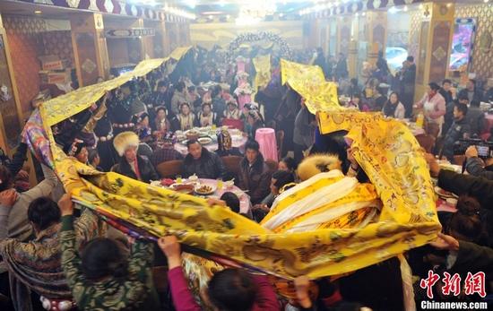 ????新郎舅舅羅爾依告訴記者,以前的藏族婚禮很簡單。婚禮當日,新娘帶著鋤頭、背簍等各種勞動工具,由家人送到新郎家,那時一般是騎馬或者坐牛車。新娘進了新郎家的大門后,要將事先準備好的禮物送給新郎的各個家人。新郎也要回送。接下來,新郎家的代表要出面把家里有多少人、牲畜、土地一一介紹清楚,囑咐新郎新娘好好過日子。新娘家的代表也有一番對新人的祝福和囑咐。