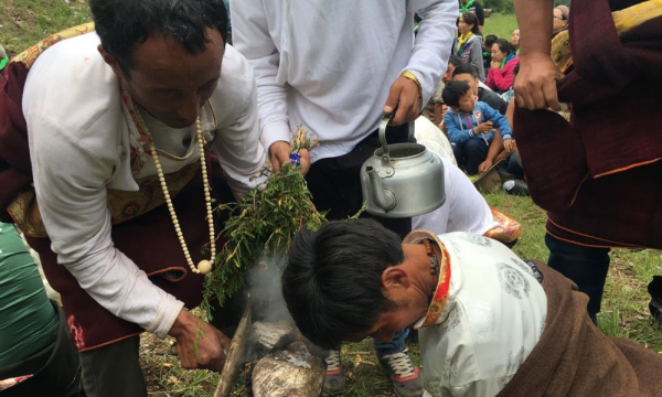 煨桑,是拉卜楞地區僧俗中最普遍的一種祈愿儀禮,最佳時間是早晨。每逢初一、初三、初八、十五、三十或宗教紀念日,一大清早起床后,首先在自家院或房頂煨桑,然后帶上柏樹枝、桑仔、