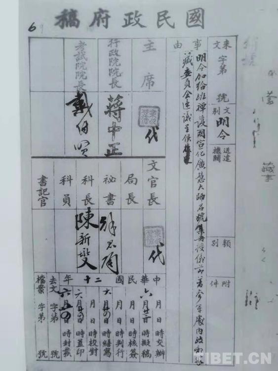 6月24日,首次應邀到南京的九世班禪受到國民政府高度評價,予以最高褒譽,因九世班禪“翊贊和平統一,此次遠道來京眷念勛勞,良深嘉慰”,并加授予“護國宣化廣慧大師”名號。