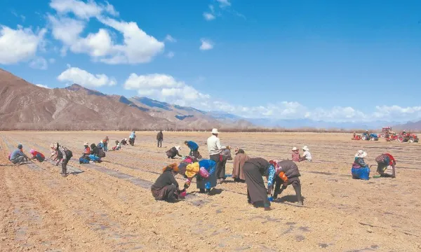 圖為在技術人員指導下,當地農民種植藥材。記者 格桑倫珠 攝 近日,總投資2500萬元的西藏拉薩市林周縣藏藥材種植項目正式開工,該項目由林周縣凈土產業投資開發有限公司和西藏