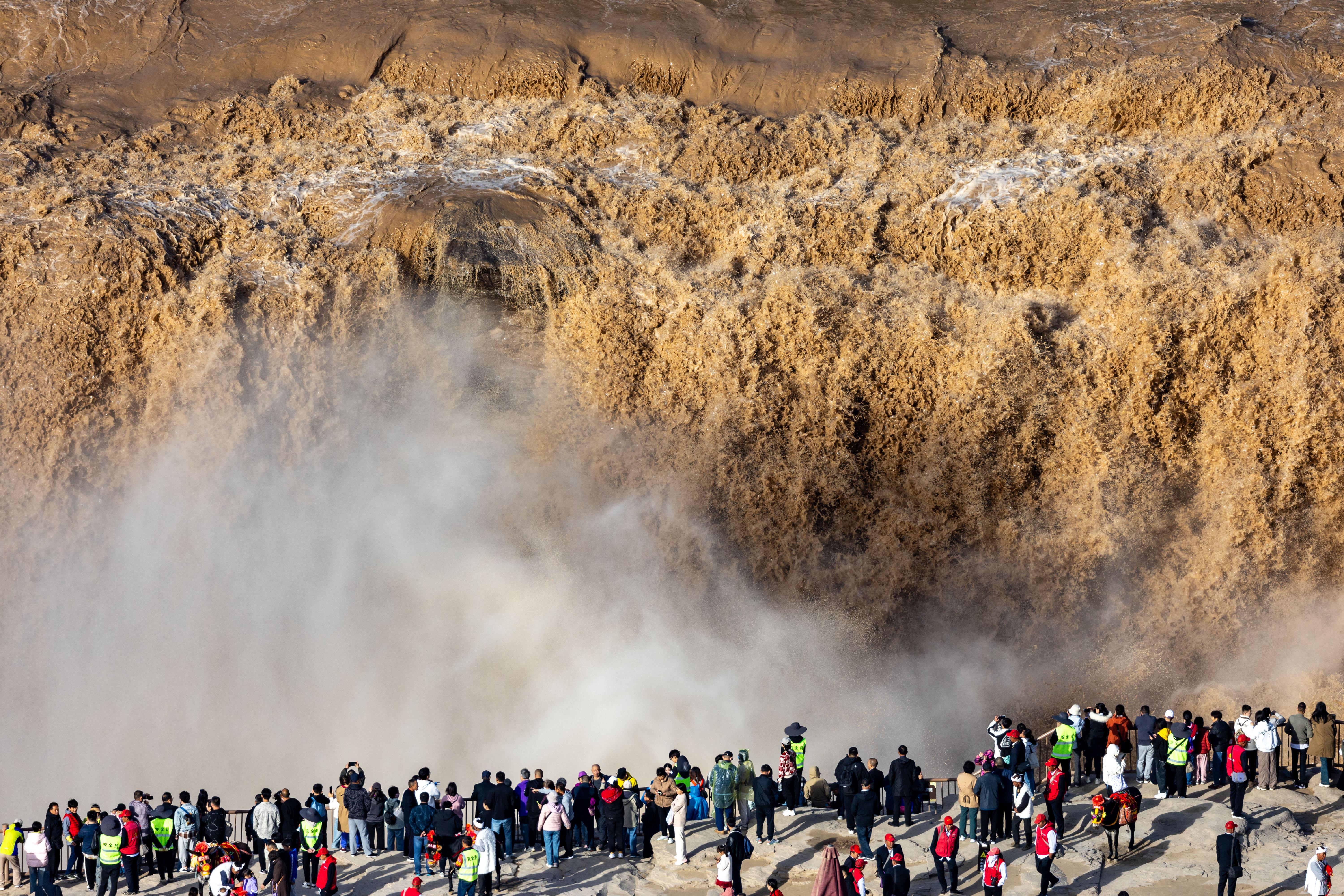 游客在山西省臨汾市吉縣黃河壺口瀑布景區游覽觀瀑(10月1日攝)。新華社發(劉宏達攝)