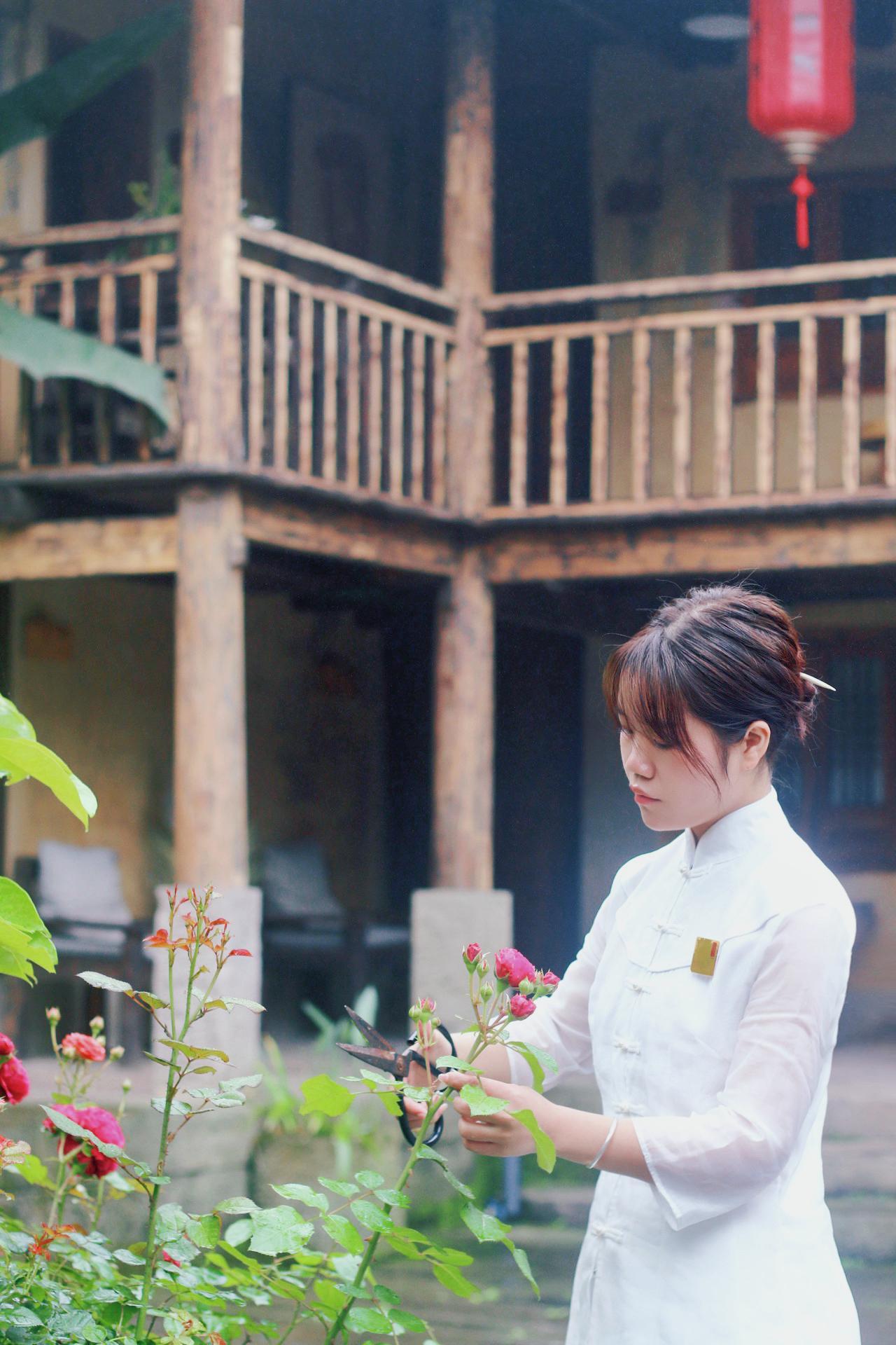 挎上竹籃,拿起剪刀,記者跟隨朱靜踏進院子旁的小花園采摘野薔薇等鮮花。隨后,再將摘下來的各色花葉一一插入花瓶,作為每間客房的擺件點綴。