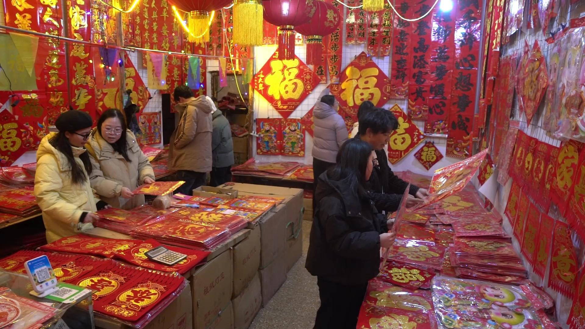 在眾多年貨中,最不能少的就是春聯(lián)和燈籠。春聯(lián)掛飾店前,紅彤彤的燈籠隨風飄揚,墻壁上掛滿了對聯(lián),洋溢著喜慶和吉祥。