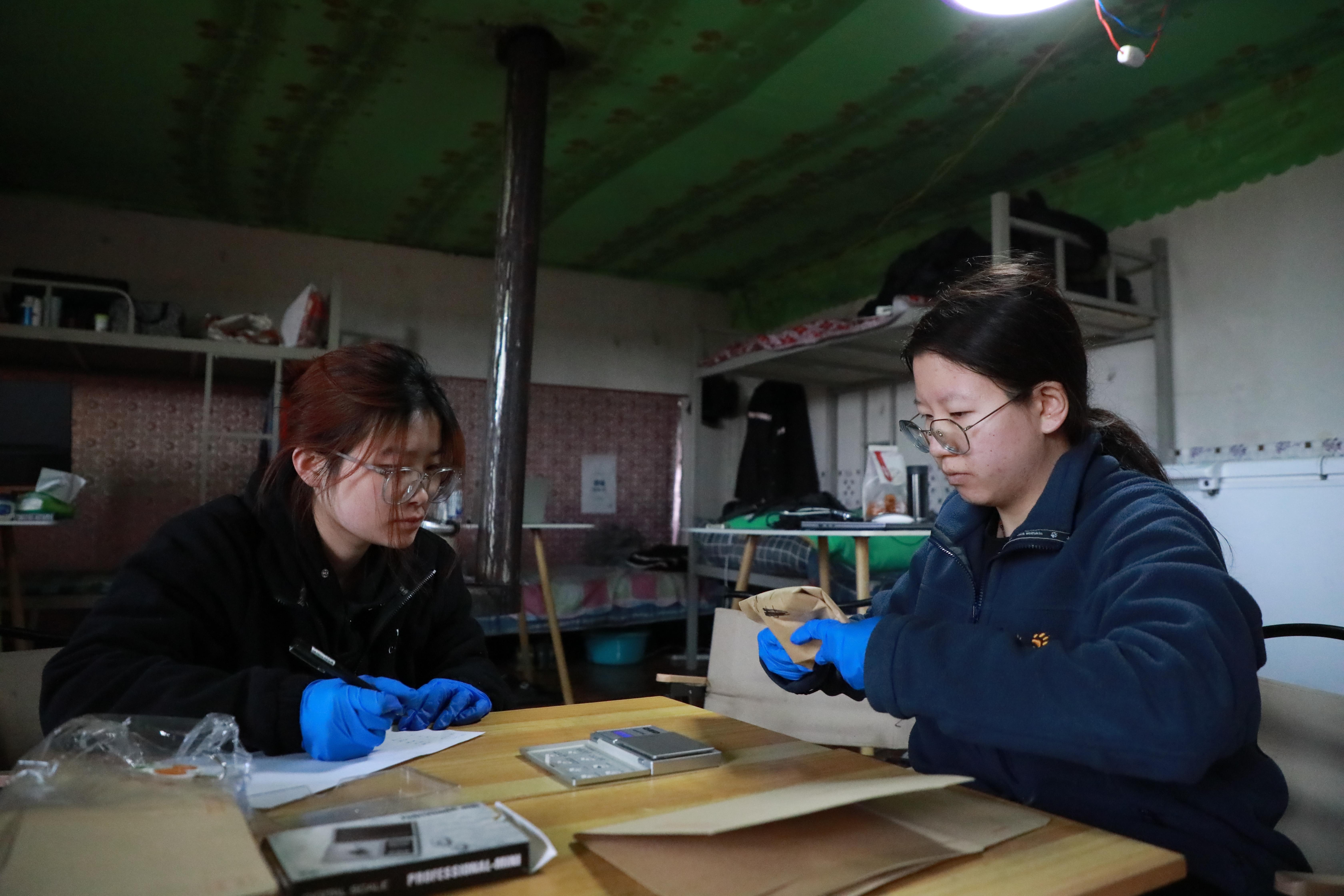 4月27日,在甘肅省甘南藏族自治州瑪曲縣,蘭州大學生態學院的在讀碩士研究生董又菡(左)和胡曉夢在給草樣稱重。