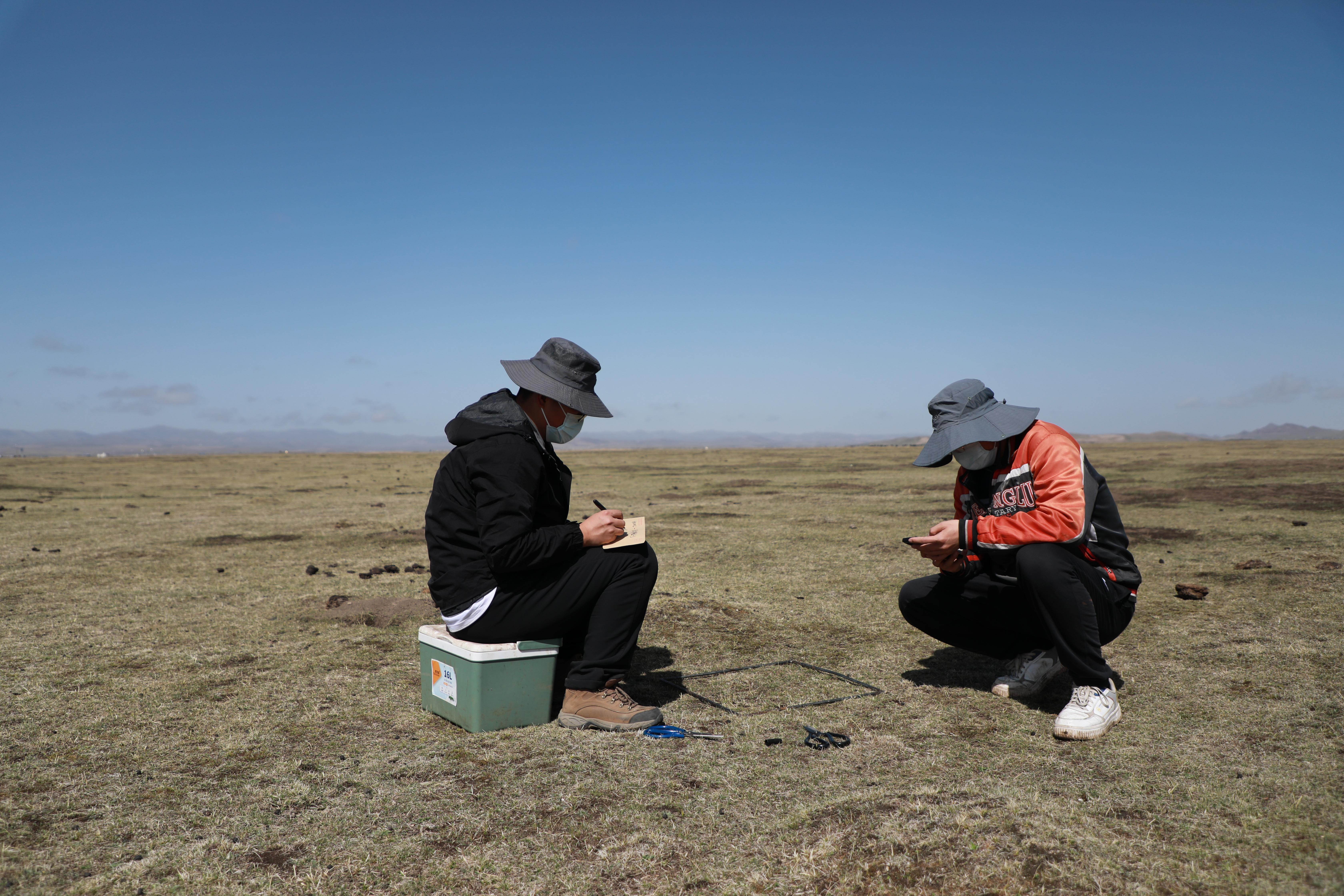 4月27日,在甘肅省甘南藏族自治州瑪曲縣的一片草原上,蘭州大學生態學院的在讀博士研究生曹澤(左)和趙志偉一邊收集草樣,一邊做記錄。新華社記者 文靜 攝